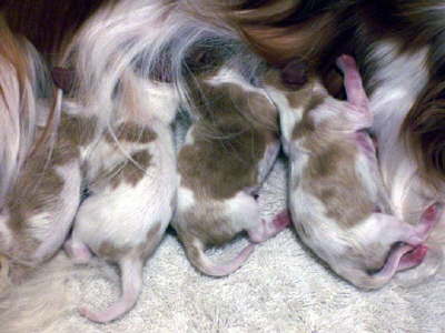 Here the puppies are nursing right after birth.  The last one born (boy #2) was so small, that I really had to watch him to make sure that he got some milk.